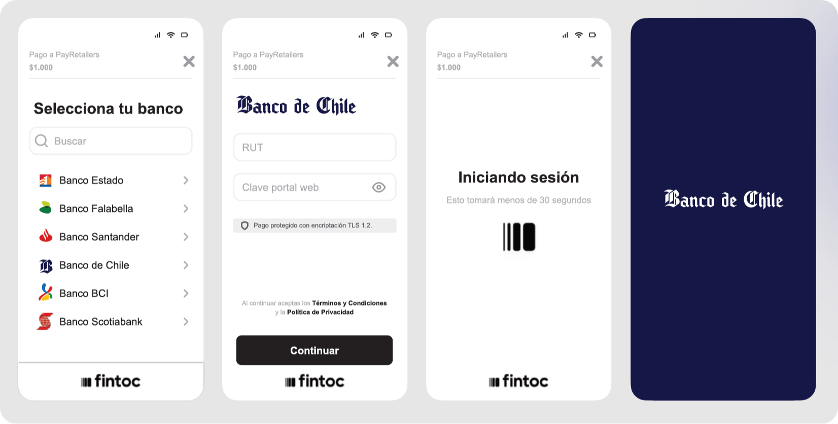 Screen 4 - Bank Login: "Ingresa a tu banco" (Enter your bank) screen for Banco de Chile: