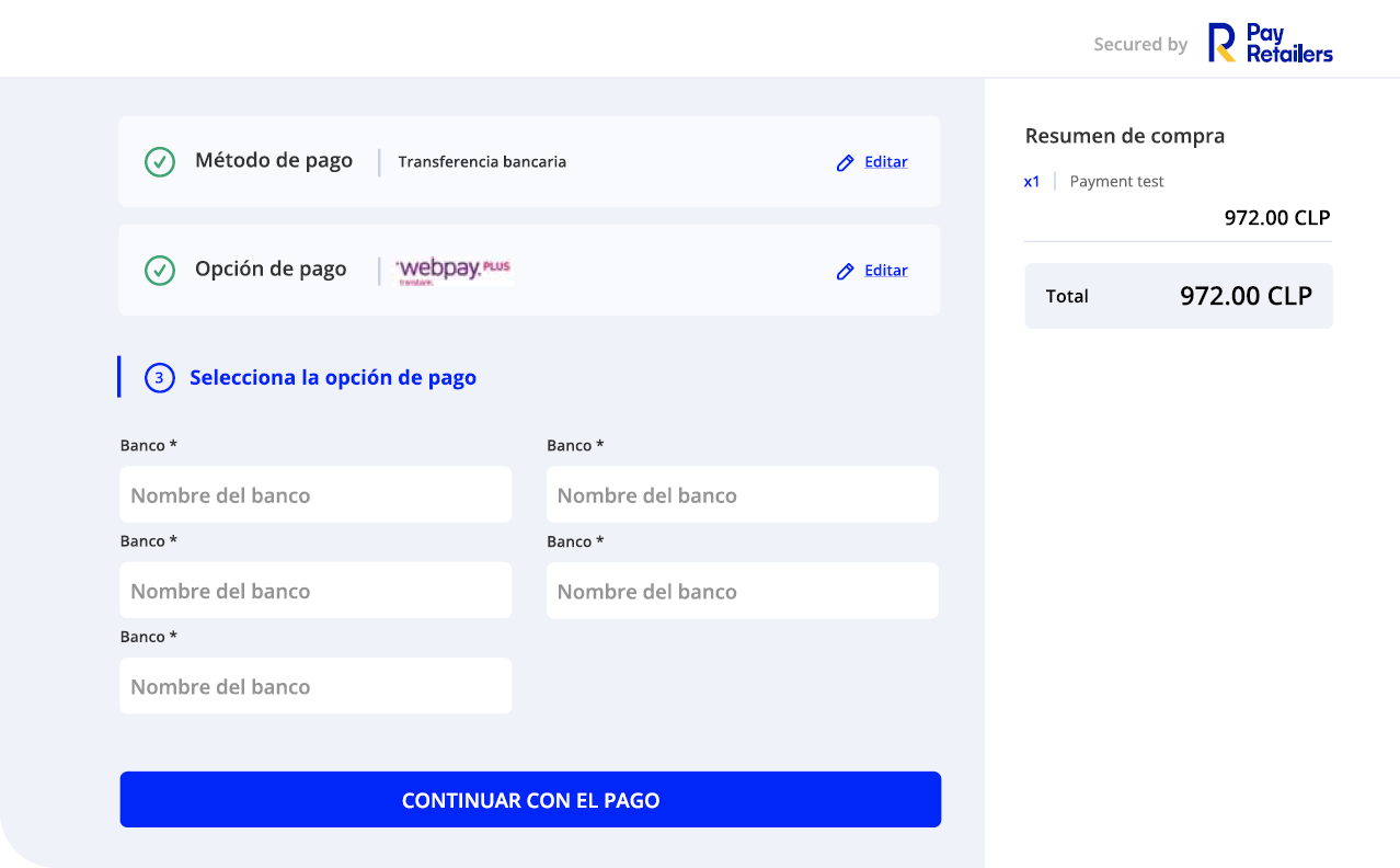 Complete the bank selection fields and click CONTINUAR CON EL PAGO (Continue with payment).