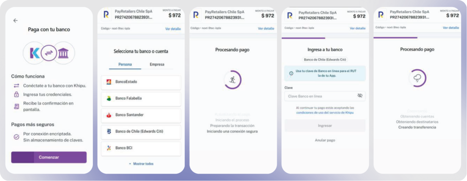 Khipu is a payment platform in Chile that enables users to pay via automated bank transfers. It connects to a wide range of local banks and simplifies the transfer process by auto-filling payment details and guiding users through their online banking environment. Khipu is commonly used in e-commerce and digital services as a cardless payment alternative.