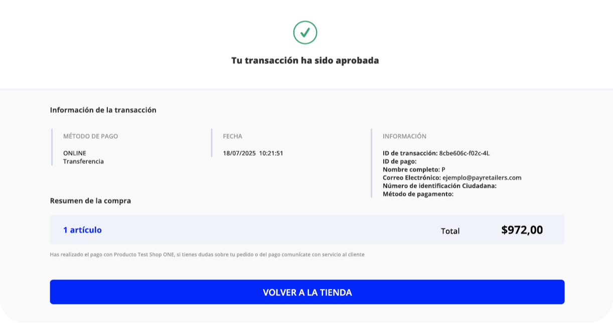 - Status: "Tu transacción ha sido aprobada" (Your transaction has been approved)