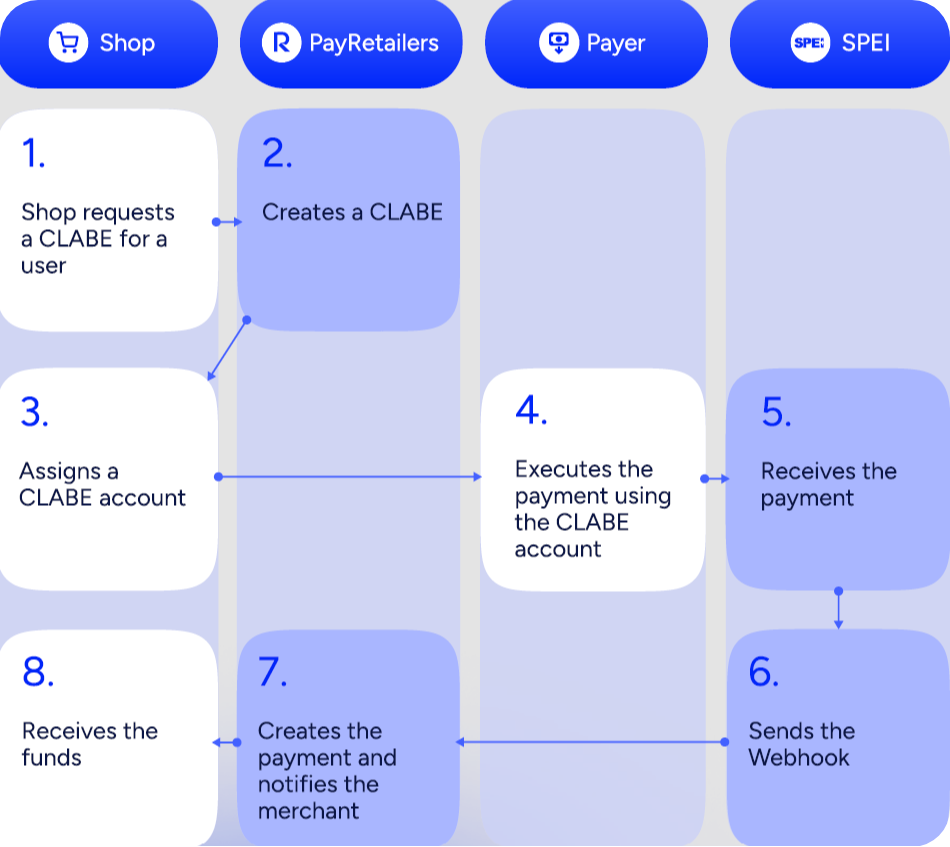 - Shop: Shop requests a CLABE for a user