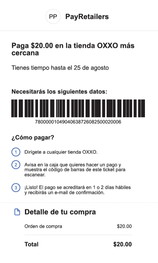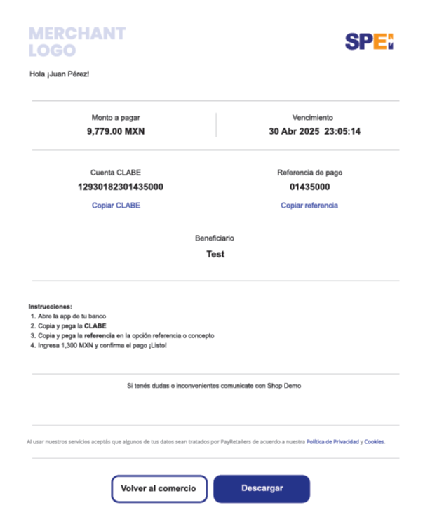 - PayRetailers: Displays the CLABE and reference number