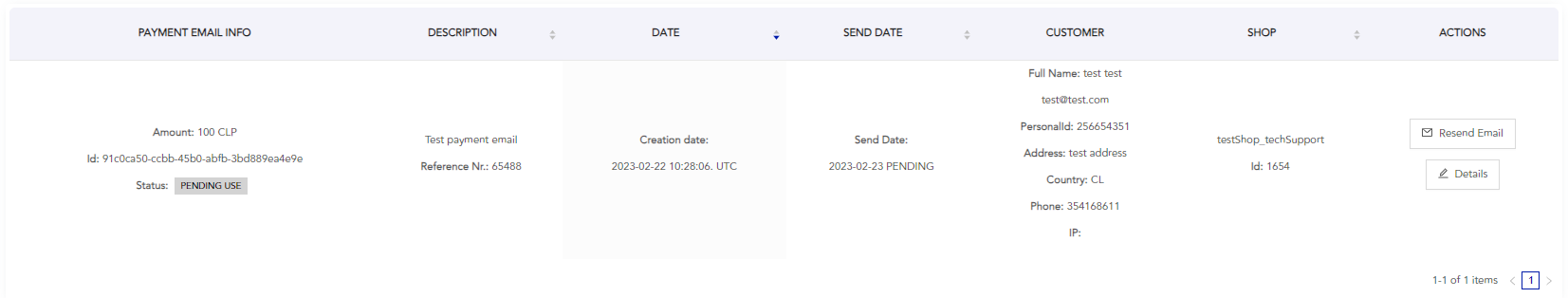 You can view your payment emails history under the Payment Links section. Please keep in mind that the ID displayed is the Paywall ID, not the Transaction ID. The status of the payment email will appear under the payment link info column. You can resend the email if needed, but you cannot edit the details. In case of a mistake that impedes the reception of the email or the payment, you will have to create a new payment email.