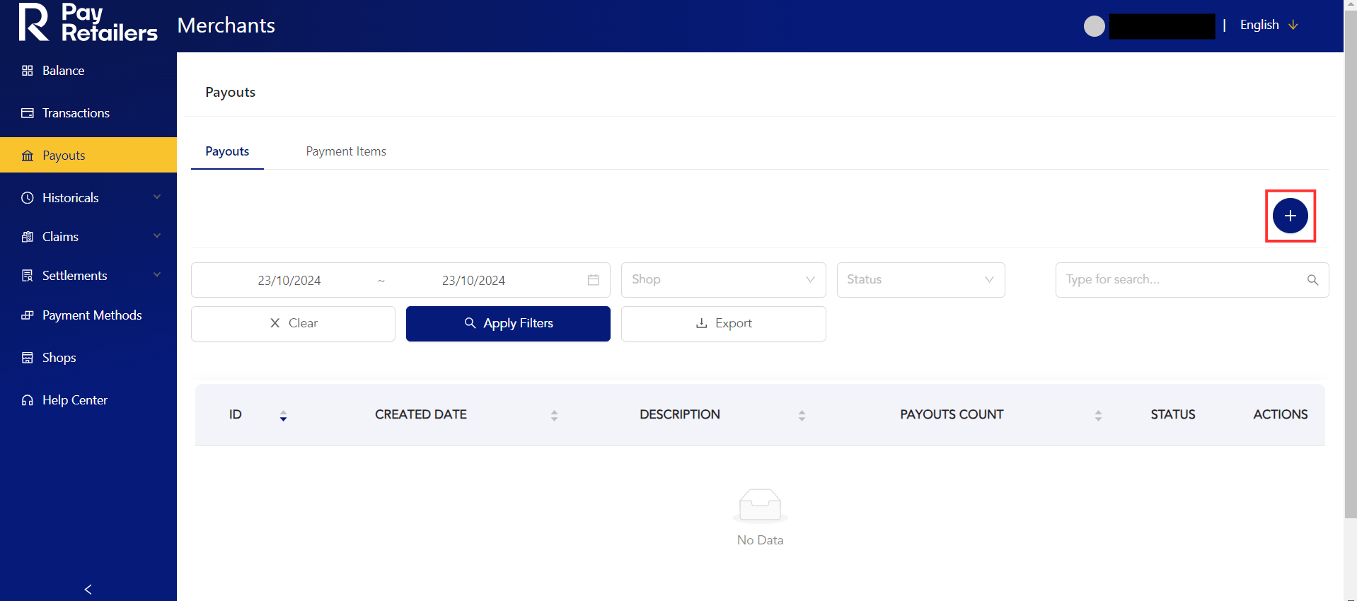 Click on the blue + button on the payout batches page to open the payout creation form.