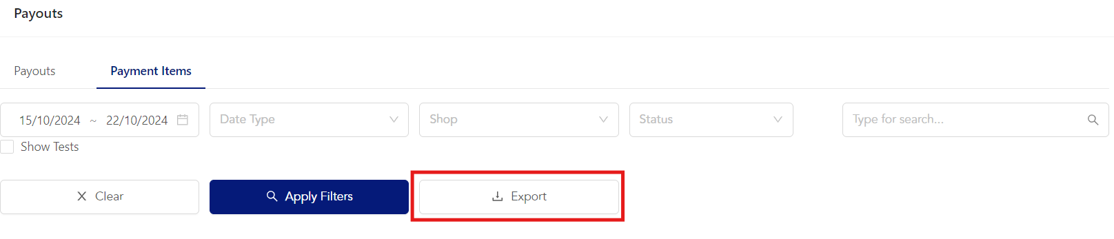 The payouts items tab lets you filter and search Individual payouts. The results will display the payout basic information: