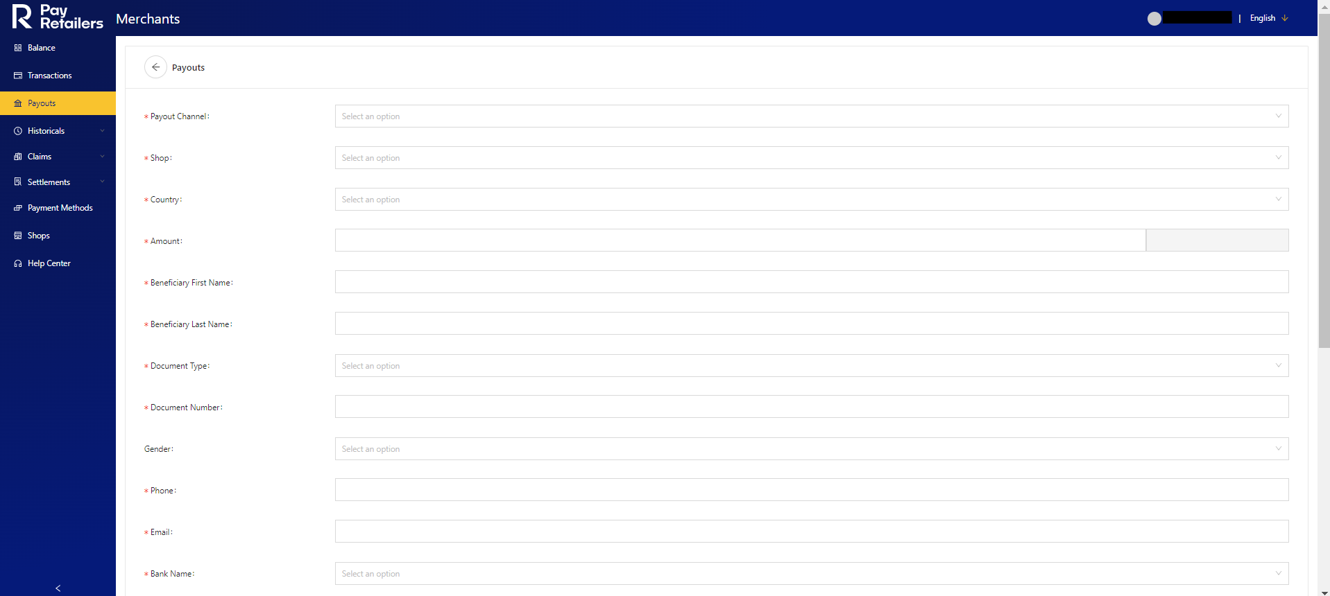 On this form, you enter the necessary information to process your payout. It's a Dynamic form that adjusts the required fields based on the selected country.
