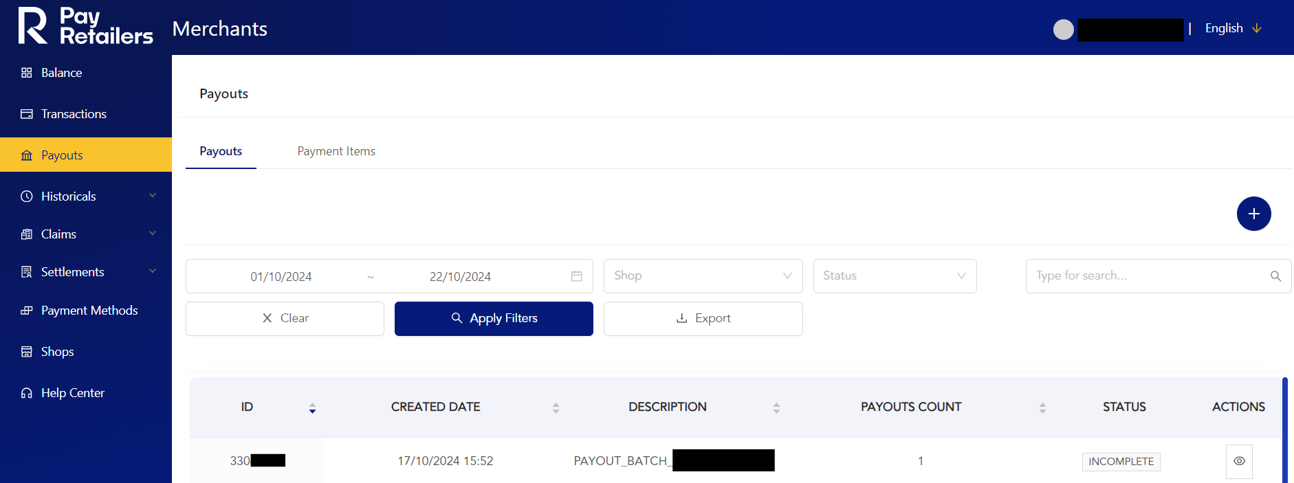 If you want to see more details about your payout batches, you can download a report by clicking on the Export button after applying your filters.